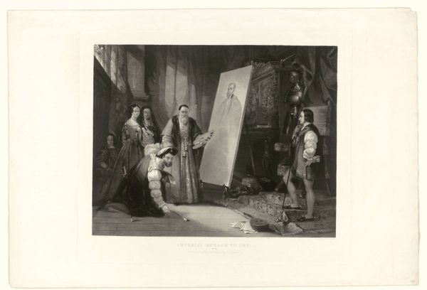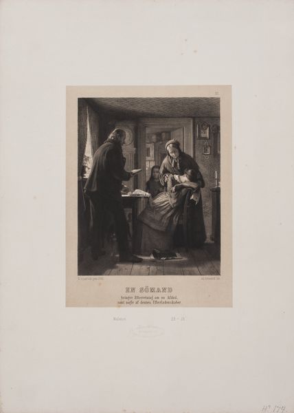 Adolph Kittendorff created this print, "En Fader frier for sin søn," which translates to "A Father Seeks a Wife for his Son," sometime during the 19th century. This scene unfolds within a domestic space, encapsulating a pivotal moment in the lives of these characters. The print offers a glimpse into the cultural practices surrounding marriage, family, and social expectations. It subtly hints at the limited agency of women within this patriarchal structure, as they were often viewed as commodities to be negotiated for the benefit of their families. The emotional tone of the piece is complex. We can sense the weight of tradition. The young woman's expression might suggest her trepidation. Is there genuine affection, or is this purely a strategic alliance? Kittendorff invites us to consider the societal forces that shape personal relationships and the subtle negotiations of power that occur within the domestic sphere. It prompts us to reflect on how much has changed, and how much remains the same, in our understanding of love, marriage, and family.