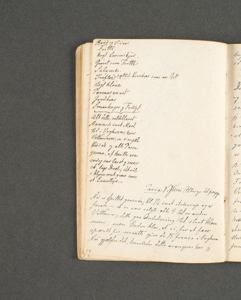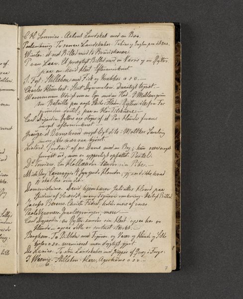 Curator: We're looking at a page from Johan Thomas Lundbye's travel journal, specifically "Rejsedagbog. Firenze," dating back to 1846. It's rendered in ink on paper. Editor: My initial reaction? Overwhelming! Like trying to decipher a historical code. All that text squeezed onto the page creates this sense of urgency, of someone desperate to capture everything. Curator: Exactly! It's less a finished artwork and more a raw, unfiltered stream of consciousness. Think of it as Lundbye's attempt to process his experience of Florence. The materiality of the ink and paper highlights the direct connection to the artist's hand. Editor: I’m also struck by how this journal format subverts the preciousness often associated with “high art.” He’s not creating a masterpiece for the Salon; he's jotting down impressions, perhaps even sketches we can't see clearly. The labor isn’t in refined execution, but in observation, transcription, and the sheer act of recording. Curator: Absolutely, and what makes this entry so interesting is that it contains a list. Lundbye catalogues his visits to galleries in Florence. Look, he mentions works by Botticelli, Tintoretto... titans of the Renaissance! It reveals Lundbye's desire to understand art history firsthand. He wanted to capture the light, the textures of his surroundings but was also committed to his own tradition of artwork that has lasting meaning. Editor: And considering his medium, it underscores the importance of documentation and dissemination within artistic communities. Journals like these were, in a way, portable museums—ways to transport knowledge and inspiration across time and space. He seems less interested in *how* these pieces were displayed but more focused on cataloguing *what* pieces are contained inside of various gallery exhibits. Curator: Yes. By documenting his visits in this way, he shares something immediate about the act of the creative process of documentation. Editor: Looking at this today, it makes you realize art isn’t just about finished products. It's equally about the process, the journey, and the messy, often illegible, attempts to make sense of the world around us. Curator: I find his need to capture that complexity so powerful, offering insight into what moves us.