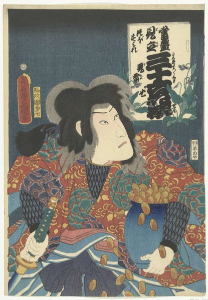 Utagawa Kunisada created 'The Actor', a woodblock print, sometime before his death in 1865. Immediately, we are drawn to the patterned robes and dramatic expression of the figure. The stark contrast between the dark garments and the light blossoms creates a visually striking effect. Consider how the artist plays with surface and depth here. The intricate patterns on the actor's robes flatten the figure, challenging traditional notions of three-dimensionality in art. This flattening effect is characteristic of ukiyo-e prints, which often emphasize decorative design over realistic representation. The sword divides the pictorial space, acting as a structural element that underscores the tension between stasis and action. The actor’s intense gaze and the sword suggest a narrative frozen in time. This work destabilizes the boundary between performance and reality. Kunisada uses form to question the very nature of representation.