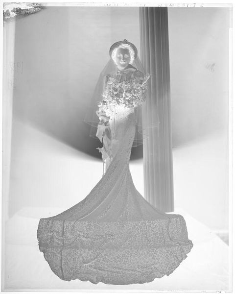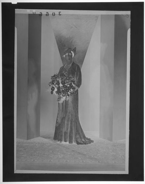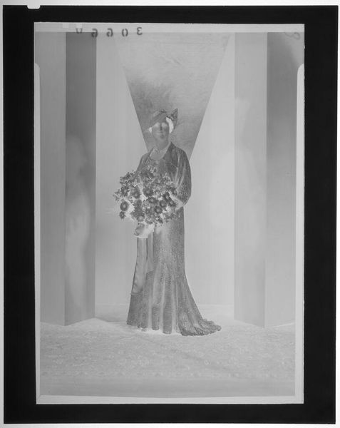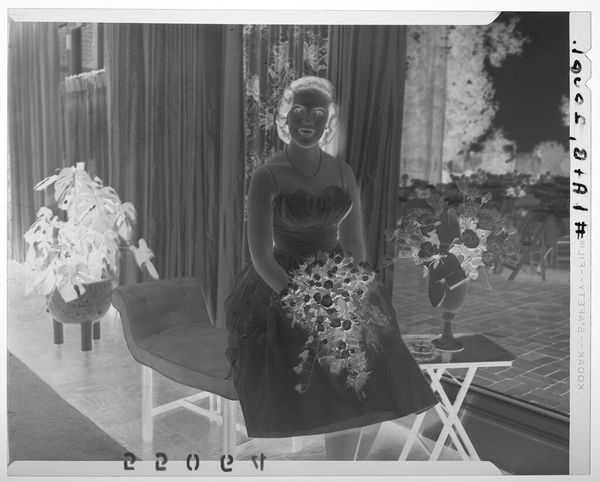 Editor: This intriguing image by Martin Schweig, titled "Untitled (bride posed in front of fireplace decorated with flowers)," shows a bride in what appears to be a reversed photographic print. The flowers and the overall starkness create an ethereal, almost haunting mood. What cultural symbols do you recognize? Curator: Notice how the floral arrangements, though celebratory, also possess a funereal aspect. The bride's pose, combined with the reversed image, evokes a sense of memory—perhaps a past idealization of marriage or even a premonition. What does the inversion suggest to you about the cultural weight of marriage? Editor: I see how the inversion could symbolize the complexities and sometimes the opposite of expectations in marriage. It makes me reconsider how we view these traditional ceremonies. Thank you! Curator: Indeed! These symbols often reveal more than we initially perceive about our shared cultural narratives and personal anticipations.