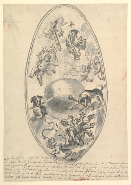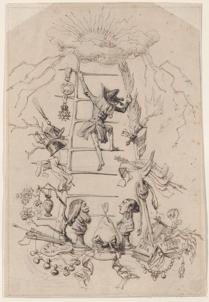 Editor: So, this is an ink drawing from the mid-19th century, sometime between 1841 and 1851, called "Illustration in Jérôme Paturot, by Louis Reybaud, Paris, 1846," by J. J. Grandville. It's intricate and almost dreamlike... with this figure climbing a ladder towards a cloudy sky with a box floating in the sky. What’s your interpretation? Curator: It's wild, isn’t it? Almost feverish. The way Grandville crams the composition with objects—symbols really—it feels like he’s trying to tell us something about ambition, maybe about the folly of striving too high. Do you get a sense of satire from it? Editor: Definitely! There’s a comedic feel with all the disparate objects strewn about, like a commentary on bourgeois aspirations perhaps? Curator: Precisely! The ladder itself, that symbol of upward mobility, seems almost rickety, precarious. Is the character climbing towards enlightenment or a box filled with nothing? Are those even clouds? Or explosions? I wonder if he felt it was worth it, reaching for the unattainable. What about the objects themselves – do you recognize any? Editor: I think I see books, maybe representing knowledge. Is that a paintbrush down there? Curator: Good eye! And notice how the ladder itself is surrounded by both symbols of high society and earthly endeavors: fine hats, grapevines... it is about balancing different values isn’t it. Think about how it feels to be so weighed down by societal norms while struggling for self-discovery. Did Grandville leave any room for genuine ascent? What do you think? Editor: That's fascinating! I was so focused on the strangeness of the image, that I did not see those contrasting ideals and values being displayed so freely! I didn’t really grasp the social commentary. I feel like I’ve actually climbed up a rung of my own ladder here. Curator: See, art makes you think! It challenges our perceptions, like peering through someone else's wonderfully warped spectacles. We carry some interesting stuff up our ladders... don't you agree?