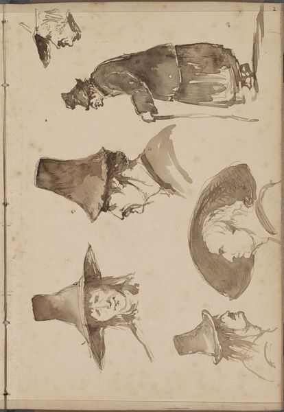 Johannes Tavenraat made this page of sketches using pen and brown ink, capturing figures and dogs with an economy of line. The brown ink, fluid and immediate, allows for a direct translation of the artist's observation onto the page. You can almost see his hand moving quickly, capturing the essence of each form with minimal strokes. The paper itself, humble and unadorned, speaks to the work's function as a study rather than a finished piece. These sketches offer insight into the artistic process, revealing how Tavenraat experimented with composition and form, and his interest in capturing the everyday. By valuing the immediacy of the drawn line, and the labor involved in close observation, we can appreciate the aesthetic inherent in the making process, challenging any hierarchy between 'finished' art and preparatory work.