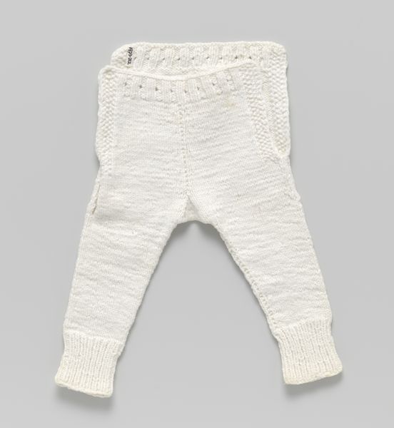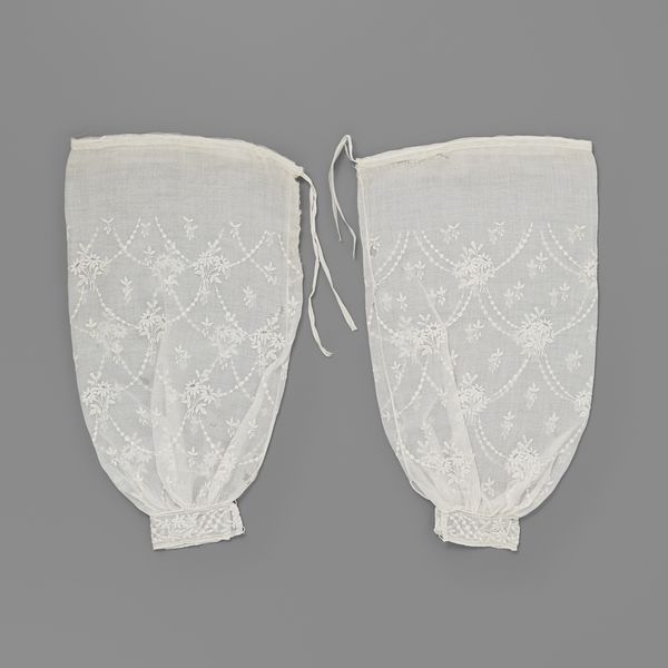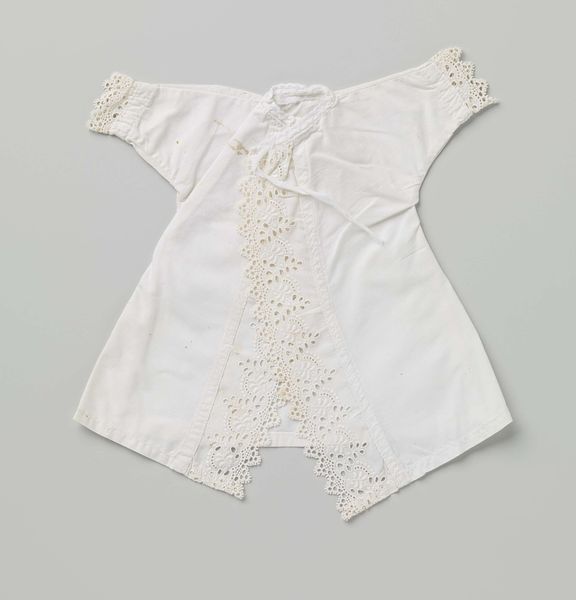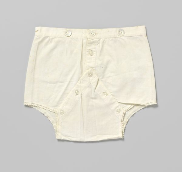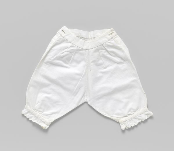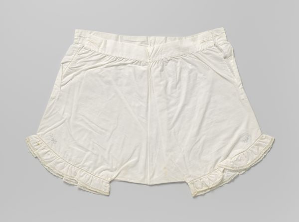 This garment, Broekje van katoen, met korte pijpen en vetertje, was made by P. Titjen-Baas with cotton. It's interesting how such a functional thing can become art, right? The texture looks so delicate. You can almost feel the softness of the cotton. It's pretty sheer, and that makes me think about vulnerability, like you could see right through it. I like the simple, clean lines, and the little lace trim adds a touch of sweetness, but it’s also frayed, so you know it’s lived a life. Look at how the fabric is sewn, those tiny stitches must have taken forever! You can see the process, the hand of the maker. It reminds me of some of Agnes Martin’s grids, the quiet, repetitive labor, the meditation on the grid, but in fabric. It’s like Titjen-Baas is saying something deep about care, time, and attention. Who knew a pair of cotton shorts could do that?