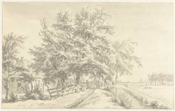 Elias Stark created this etching, "Landschap bij Baambrugge," capturing a landscape near Baambrugge. Stark, living from 1849 to 1933, navigated a world undergoing rapid industrial change even as rural life persisted. This work offers a window into the Dutch countryside, subtly engaging with themes of identity, class, and the changing social landscape. The detailed rendering of the thatched-roof houses and the figures sitting outside hint at the intimate, everyday lives of the rural working class. Stark presents a narrative that is both observational and personal. What stories do these figures hold? Are they the heart of Stark's work? "Landschap bij Baambrugge" invites us to consider the intersection of personal narratives and broader societal shifts, reflecting on the emotional and material conditions of life in the Dutch countryside.