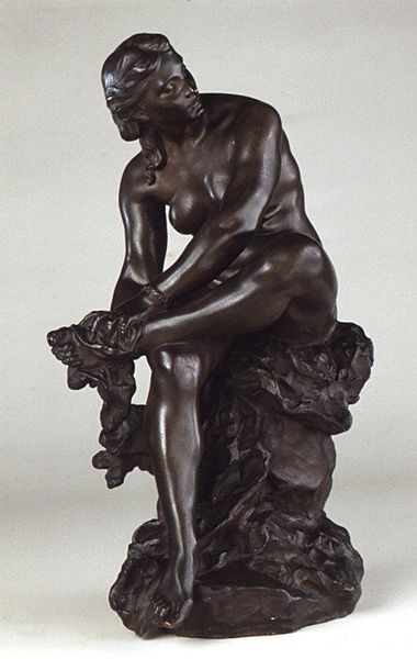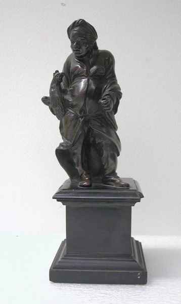 Editor: We're looking at "The Savior," a 19th-century sculpture by Giambologna at the Met. It’s this almost melancholy figure cast in a dark bronze, standing on an ornate base. The draped fabric and slightly bowed head evoke a sense of suffering. How do you interpret this work, particularly in relation to its historical context? Curator: It’s essential to consider the cultural politics embedded within such devotional imagery. "The Savior," though seemingly traditional, was created during a period grappling with evolving notions of faith, power, and representation. Who is being "saved," and from what? The very concept of a savior figure has historically been used to legitimize hierarchies and maintain social order. Editor: So, you're saying it's not just a religious sculpture, but it has a socio-political dimension as well? Curator: Precisely. Giambologna, even while working within established artistic conventions, was subtly engaging with complex power dynamics. This wasn't merely about depicting religious iconography; it's about how that iconography reinforces certain ideologies, especially those around masculinity and subservience, further explored in feminist and postcolonial theories. Can we really look at a work like this uncritically? Editor: I never thought of it that way, the work seems much more problematic now. I learned that even historical art, particularly with religious connotations, should be regarded with its deep sociopolitical implications Curator: Absolutely. Our role is to ask those hard questions and acknowledge the work's intersectional narrative, and prompt thoughtful dialogue surrounding themes of power and gender, even if those conversations may make some uncomfortable.