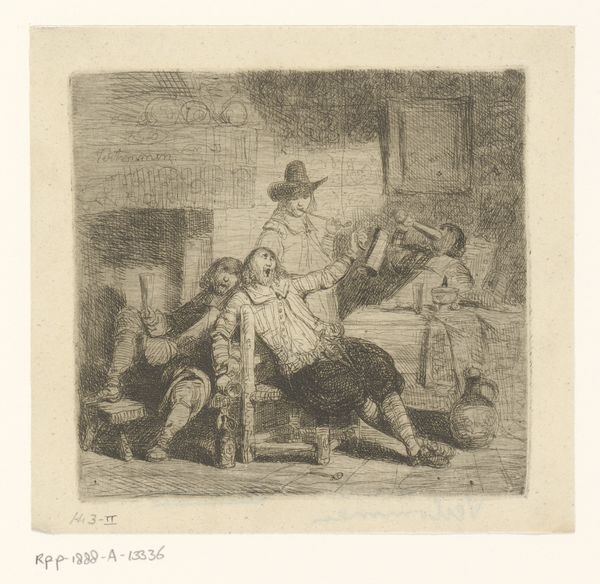 Editor: This print, titled "Boodschappenjongen op paard voor een huis met twee vrouwen en kind" – or "Errand Boy on Horse in Front of a House with Two Women and Child," created between 1823 and 1829 by Abraham Raimbach, and housed here at the Rijksmuseum – really captures a sense of everyday life. What visual cues strike you as significant? Curator: Immediately, I see a clear illustration of social hierarchy through dress and pose. The errand boy, on horseback but looking downward, versus the standing women with bonnets who seem to be receiving goods or payment. Note also the child and dog; symbols of domesticity, rootedness. These are not chance encounters, but embedded rituals. Do you notice the repeated motif of contained space? Editor: The doorway, definitely. And also, the stable or yard that frames the boy? It feels like we're observing a carefully constructed stage. Curator: Exactly. Consider the horse. A beast of burden, yes, but also a symbol of travel, of messages carried. It links these domestic spaces to the world beyond. The light and shadow play, too, seems intentional, almost moralizing. What emotional response do you get? Editor: A little somber, maybe? There’s activity, but everyone seems caught in their role. Like components in a cycle of service and exchange. Curator: And does that echo in any familiar narratives for you? Perhaps social power dynamics or expectations of labor and reward? Even today, the weight of those symbols endure, just in different costumes. Editor: That's fascinating – I hadn't considered the continuity of those power dynamics through imagery. Now I see it’s less about a simple errand, and more about a visual representation of a societal structure. Curator: Indeed. The print becomes a coded message reflecting a shared understanding within its cultural context.