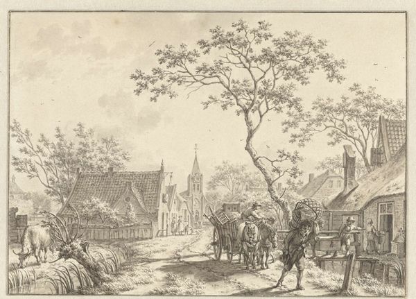 Curator: This is a fascinating landscape titled "Dorpsgezicht met herberg en windmolen," placing it somewhere in the range of 1720 to 1820, by S. Le Masurier. The artist utilized both etching and engraving techniques to achieve this level of detail. Editor: It's an incredibly lively scene. The etching technique creates a kind of shimmering effect that feels almost… festive. And that towering windmill on the hill, a powerful symbol dominating the composition! Curator: Absolutely. Note the social context; the etching/engraving process allows for multiples. This allows for much broader consumption, of both images and the values within. And look at the subject. It captures not just a landscape but a whole ecosystem of labor and commerce. Editor: I see the windmill, naturally, as a central symbol of Dutch identity, of industry and resilience. But notice the details in the tavern scene; what kind of social bonds, celebrations or perhaps even commerce occurred in sites such as that one. Even, class dynamics! The equestrian figure stands in contrast with the people seated for example. Curator: Indeed. Consider the technical skill required to create this level of detail with etching and engraving tools of that period, not to mention managing a complex scene so focused on materiality. From the rough spun garments of the peasantry to the harnesses of the horses. How labor is depicted also is worth our reflection. Editor: And how cleverly it weaves a narrative using commonplace imagery! We know how the Dutch landscape tradition uses imagery such as mills and ships but also public life to define itself. This creates an opportunity for both reflection and perhaps celebration, to instill collective cultural pride! Curator: Yes, exactly. What began as a landscape transitions into social commentary on how labour, and nature are intertwined. How consumption can come from a material process and beget more meanings, depending on context. Editor: Precisely! A simple genre scene contains rich symbols about that era. So very Dutch! Curator: Well said. Hopefully, visitors now have more points to consider when viewing this artwork! Editor: It’s more than just a scene, it is an insightful landscape, even from its period of production.