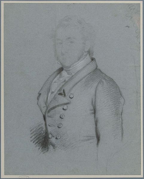 This drawing, tentatively identified as a sketch for a portrait of Hendrik Hooft Hasselaar, was made by Charles Howard Hodges. The delicate white chalk lines on the blue paper support give the sitter an ethereal quality, as if Hodges is capturing not just a likeness, but a fleeting impression. Look at how Hodges uses line to define form. The lines are not just outlines but carry tone and weight that gives shape to the man's face and clothing. Consider how the subject is positioned. The slight turn of the head and the gaze directed off to the side lend the figure a dynamic quality, suggesting a moment captured in time. The book in his hands might function semiotically, as a signifier of knowledge or status, but more importantly it anchors the composition. Hodges’ sketch destabilizes conventional portraiture by presenting a study rather than a finished work. It invites us to consider the artistic process, and to appreciate the beauty in the incomplete, suggesting that a work of art can exist in a perpetual state of becoming.