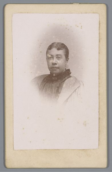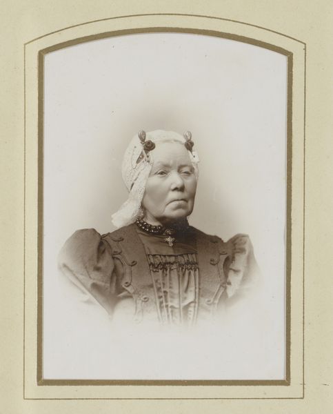 Curator: This is "Portret van een vrouw met witte klederdrachtmuts" by Atelier Siewers, dating from around 1880 to 1920. The piece presents us with a photographic portrait of a woman in traditional attire. Editor: The immediate feeling I get is one of stoicism. Her gaze is so direct, almost challenging, but there’s also a vulnerability there, a sense of lives lived. Curator: Absolutely. These studio portraits served a vital social function in that era. They were often commissioned to represent someone’s social standing and family history, reflecting specific community identities and roles. Editor: I’m also thinking about how the very act of sitting for a photograph was likely quite formal. I mean look at the precision of her white bonnet against the simplicity of her dress. Did this adherence to a formal way of life define or restrict identity and social status at the time? Curator: Precisely. The traditional dress is far from an accident. It’s actively constructing a deliberate identity for the sitter—affiliation with community, upholding values of heritage. Also, in constructing a portrait, ateliers like Siewers played a part in the development of photographic portraiture. They contributed to ideas around representation of women, and created enduring images. Editor: It's a poignant reminder of the strength, and potentially also constraints, imposed on women to conform to traditions during this period. You start to question the limitations set around those lives, set around representations of femininity at the time, even in supposedly ‘realist’ artworks. Curator: Yes, the social performance inherent in this image resonates far beyond a mere likeness. Think about the conventions around portraiture in different layers of Dutch society, ideas about ideal femininity, and it opens the work into a wider field. Editor: It does. What this picture really asks us is, ‘what kind of lives are these representations leaving out?’ Curator: Indeed. And by paying close attention to that very tension between appearance and agency, we can unlock stories and perspectives of past lives. Editor: A compelling reflection then, that the silence within a portrait can reveal volumes if we only pause to really look and listen.