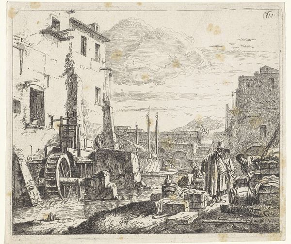 Giovanni Battista Mercati created this etching titled 'Ruins of Palazzo Maggiore in Rome and nearby buildings' sometime between 1606 and 1645. The image presents a stark, almost theatrical landscape dominated by the ruins on the left, juxtaposed with more intact buildings to the right, all under a dramatically lit sky. Notice how Mercati uses line and perspective to structure a visual experience that unsettles any comfortable sense of order. The ruins, rendered with dense, cross-hatched lines, contrast sharply with the smoother textures of the inhabited buildings. The light emanating from the clouds casts long shadows, creating a play of light and dark that emphasizes the state of decay and transformation. The architecture, neither fully present nor entirely past, complicates any stable interpretation. It prompts us to consider the relationship between permanence and transience, challenging fixed notions of time and architectural integrity. Through this formal arrangement, Mercati invites us to contemplate how ruins function not just as remnants of the past, but as active sites of cultural and historical re-evaluation.