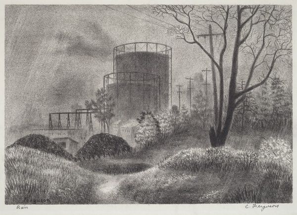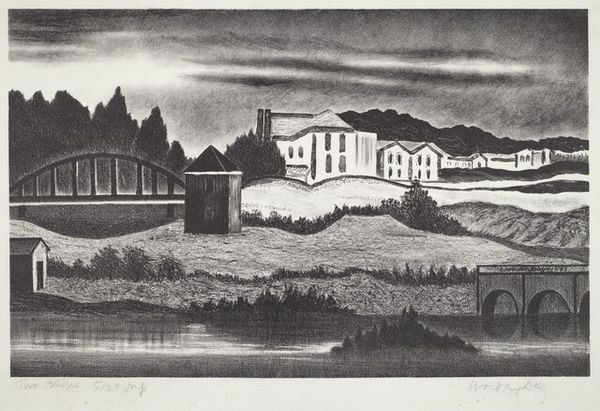 Curator: "Shacks by the Road," an etching by Samuel L. Margolies, made sometime between 1935 and 1943. What strikes you first? Editor: The stark contrast. It's bleak, a real sense of struggle comes through. The texture is almost gritty, like you could feel the dust just by looking at it. Curator: Yes, it's very immediate. Margolies wasn’t just depicting poverty; he was deeply affected by it, wouldn’t you say? It speaks to a profound sense of place, a harsh one. Editor: I think the choice of etching emphasizes that hardship. The marks are direct, laborious. You can see the process. And notice how the buildings are situated almost under this massive overpass…it looks temporary and neglected. It is about the raw realities and marginal living during that era, highlighting a kind of 'architecture of necessity.' Curator: True, that bridge looming over seems to symbolize progress maybe even an indifferent society towering over the downtrodden. I also see it as having a stark beauty to the line and shadows, a story told by the absence of color. Editor: For me, the material conditions really drive the emotional power. The plate, the acid, the press – these were the means to give form to what was there. It takes you to a space where craft and class anxieties meet on paper and then a little barrel outside! It feels so lived-in, despite the austerity. Curator: Exactly. It transcends mere depiction. When I view this piece, it reminds me that even the most vulnerable structures hold stories, lives, even little dreams, like those depicted in fairytales. I see something deeply poetic even in the hardship represented here. Editor: Perhaps...but without understanding the materials and conditions that enabled and shaped this work, those poems risk being idealized, don't you think? Curator: You're right, of course. It's about balancing that sensitivity with the hard reality. Editor: It adds a layer of empathy to this piece by thinking more closely of where the medium can take the message. I learned to think in depth and feel at length looking at it.