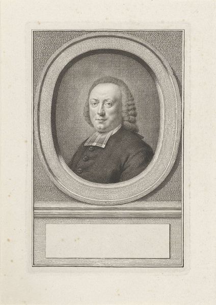Curator: Here we have a portrait of Aalbert Wels, a print created around 1788. It’s currently held in the Rijksmuseum collection. Editor: My immediate impression is one of poised contemplation, conveyed through its balanced composition, a very serene and controlled emotional atmosphere, despite its rather modest scale. Curator: Indeed. The formal aspects speak to that. Notice the oval frame and rectangular outer border, each adorned with decorative elements. The sharp lines of the engraving contrast nicely with the curvature suggesting a considered formalism. The print employs line work and tonal art principles quite expertly. Editor: From a historical perspective, Wels was, as the inscription states, the Director of the Patriotic Society in Rotterdam. These societies emerged during a time of political upheaval in the Netherlands, advocating for reform. This print, then, wasn't just a likeness, but a piece of political communication. Curator: Precisely, the gaze is rather self-assured, the placement of his hands are both relaxed and purposeful, as if to present himself, but also what he is holding. The rolled-up paper surely signifies his intellectual or professional life. Also, the books in the background, do they not suggest education? And importance through being associated with knowledge? Editor: Without question. The text beneath the portrait seems celebratory, almost a eulogy despite the subject being alive at the time. Such prints often served to immortalize figures, aligning them with ideals of enlightenment and civic virtue. Look at his medal – that undoubtedly signals an affiliation or honour of societal importance. Curator: Notice how his face is brought forward through careful shading. How that shadow pulls the viewer toward his facial expression… Editor: Exactly, the framing and text function together to solidify Wels's public image, very clearly crafted for distribution and remembrance within his circle. Curator: Considering the careful design and controlled application of values, this is no mere representation, but a constructed image intended to impart certain qualities onto the subject. Editor: It’s a visual argument as much as a likeness, a testament to the power of portraiture in shaping historical memory. Curator: Considering all this, what this engraving lacks in bombast, it more than makes up for in the carefully managed dissemination of information and controlled design elements. Editor: I find the interplay of those elements makes engaging with its history particularly enriching.