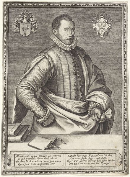 Wealthy Dutch merchants eagerly paid to have their status immortalized by eminent artists like Hendrick Goltzius. Jacques de la Faille commissioned these portraits (see P.80.31.2) the year he married Josina Hamels. Instead of using his portrait to proclaim his business acumen, however, he presented himself in his role as a commander of the Antwerp civic militia. Weaponry fills the lower region while a drummer and halberdier command the upper margin.