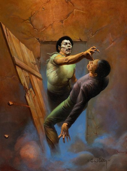 Ken Kelly's ‘Skull Face’ painting vibrates with symbols of mortality and bondage. Here, the Grim Reaper appears as a skull-faced specter holding an ornate lamp, an ironic gesture toward illumination. The muscular figure bound in chains evokes classical images of martyrdom, a testament to human endurance amidst suffering. The ‘vanitas’ motif of the skull, ubiquitous across epochs, serves as a memento mori, reminding us of life’s transience. Compare it to the skull in medieval danse macabre scenes, or even in modern street art, where it still provokes a primal awareness of death. The chained figure mirrors the iconography of Prometheus, forever bound as punishment for his gift to humanity. The emotional intensity of the scene taps into our collective anxieties about death and the struggle for freedom. This echoes through art history, a potent psychological symbol passed down and adapted, resonating across generations.