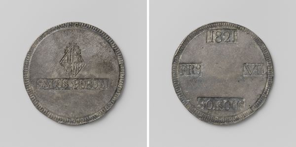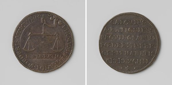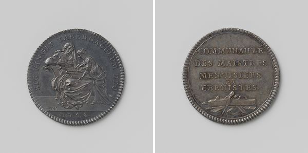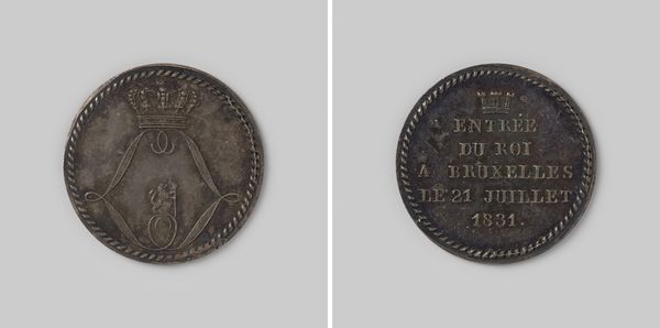 Editor: Here we have a commemorative silver print from 1831 by Adrien Hippolyte Veyrat, titled "Intocht van Leopold van Saksen-Coburg te Brussel," or "The Arrival of Leopold of Saxe-Coburg in Brussels". The imagery is quite minimal—a crown, a monogram, a date. How do you interpret the composition and the visual elements in this work? Curator: Looking at the object formally, one immediately notes the duality established by the coin's two sides. The obverse is dominated by symbolic elements: the crown, meticulously rendered, resting atop the intertwined "L" monogram. This creates an elegant, almost symmetrical arrangement, save for the inclusion of the heraldic lion below. Consider the line quality; notice how Veyrat employs subtle variations in the engraving's depth to achieve a nuanced textural effect, despite the inherent limitations of the medium. Editor: So, the details matter even in such a small piece? Curator: Precisely. The reverse presents a textual arrangement: "ENTRÉE DU ROI A BRUXELLES LE 21 JUIL 1831". This is an assertion, a clear statement memorializing the event. The relationship between the visual symbolism on one side and the declarative text on the other constructs meaning. It demands the viewer consider the relationship of the signifier and signified through its composition. Editor: I see, it's not just about what it depicts but how it depicts it. I appreciate your perspective on the importance of form in understanding the art’s statement! Curator: Indeed. The meticulous craftsmanship evident in both sides transforms the silver round beyond mere currency or simple documentation; it's elevated to a formal study of power, iconography, and remembrance.