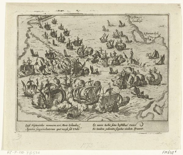 Frans Hogenberg created this print titled, Overwinning op de Spaanse vloot bij Vlissingen, 1573. The print depicts a naval battle during the Eighty Years' War, a conflict deeply entwined with religious and political identity. Hogenberg, working within a tradition of historical documentation, captures the clash between the Dutch rebels and the Spanish fleet. The image is more than a record of war; it's a visual construction of Dutch identity in opposition to Spanish oppression. Consider how the sea, often a symbol of freedom and opportunity, becomes a battleground for liberation. The billowing smoke and sinking ships evoke the high stakes and human cost of the conflict. This print reflects a pivotal moment in Dutch history, shaping national identity and challenging the established power structures of the time. It speaks to the enduring human desire for self-determination and the willingness to fight for it.
