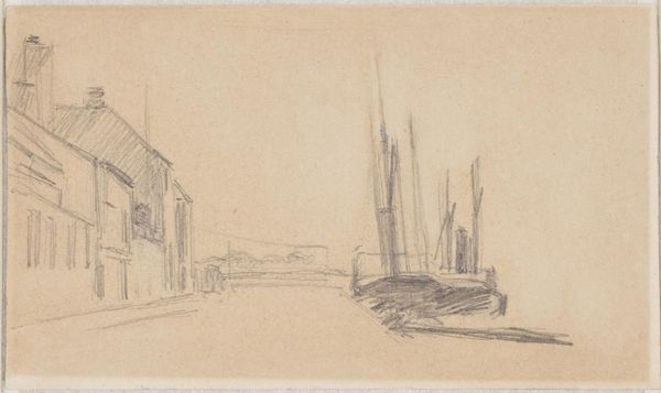 Curator: Let's talk about "Kronborg set fra vest," or "Kronborg Seen from the West," a pencil drawing created sometime between 1866 and 1906 by Albert Gottschalk. It is currently held in the collection of the SMK, the National Gallery of Denmark. Editor: My first impression is a sort of serene incompleteness. The delicate pencil strokes create a hazy, almost dreamlike image of the castle. There's an immediate sense of stillness. Curator: I see that too. Gottschalk, though painting primarily in a time dominated by academic styles, aligned with Impressionist tendencies—emphasizing atmosphere over strict representational accuracy. Look at how he captures the light on the water with just a few deft strokes. This aligns with the shifting social emphasis on the individual experience during the late 19th century, right? Editor: Absolutely. I'm particularly struck by the contrast between the solidity of Kronborg Castle and the ephemeral quality of the water and sky. The castle has obvious associations with power and control, whereas the atmospheric conditions have more elusive connotations. It really invites a conversation about the nature of enduring power versus the forces that diminish and weather any imposition. Curator: Precisely. Kronborg was not only a strategic fortification, but a symbolic representation of Danish national identity. Gottschalk reduces that formidable architecture to something almost vulnerable here. I find that quite interesting. Editor: I agree. It's a kind of deconstruction, then, almost resisting the expected monumental portrayal of a symbol deeply intertwined with the military and economic interests of Denmark, historically speaking. Curator: Yes, and consider also who would be moved to create a subtle landscape drawing in that specific time and place. Understanding this is to bring Gottschalk and the artistic milieu he participated into conversation. Editor: It invites reflection on themes of transience and perhaps, even the limits of national identity in a world that was rapidly becoming more connected. It makes the viewer reconsider preconceived notions of what landmarks of state and power symbolize in a new light. Curator: Indeed. Gottschalk compels us to contemplate not just what we see, but also how we see it. Editor: This small sketch offers a glimpse into a moment of quiet contemplation. Thank you for shedding light on the bigger ideas that can be derived from what may, at first glance, seem unassuming.