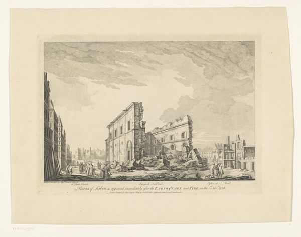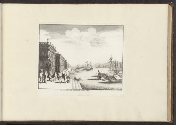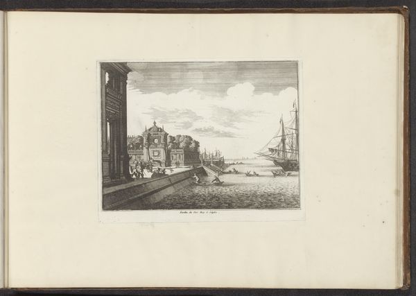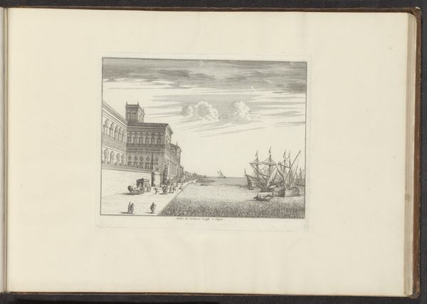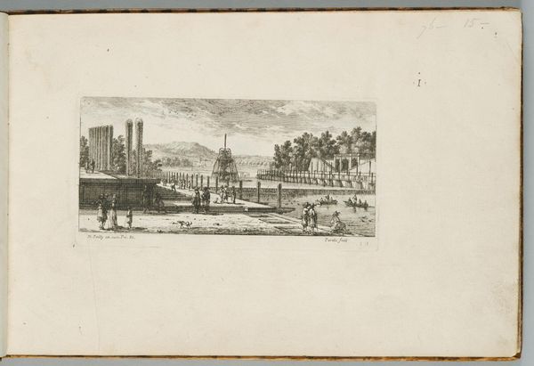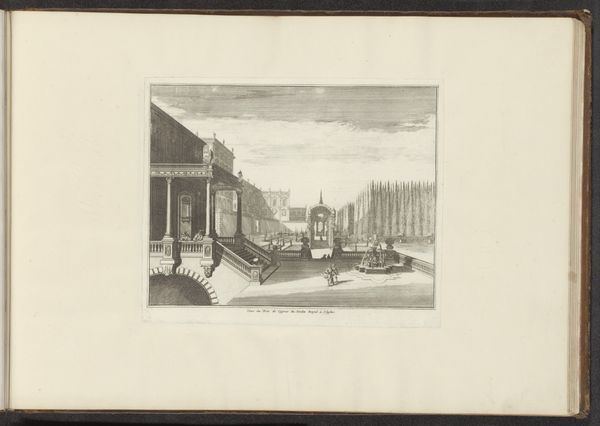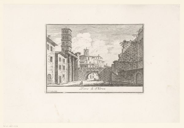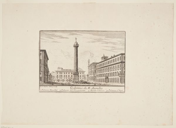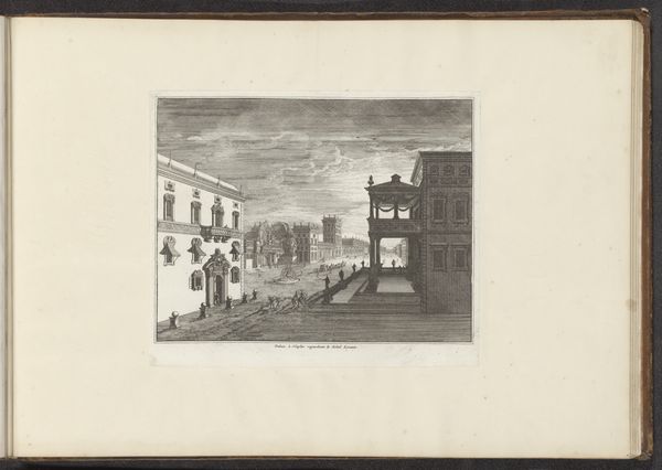 Curator: This is a rather striking print from 1680 titled "Zuil van Marcus Aurelius met rechts de Tempel van Hadrianus," an architectural drawing rendered in ink. What’s your initial response? Editor: Stark, almost bleak. There’s an incredible emptiness despite all the architectural details—like a stage set stripped bare. The looming column hints at power, but what kind? It feels authoritarian, maybe? Curator: Let’s unpack that. Technically, note the precision in the lines depicting the Temple of Hadrian on the right. See how the artist uses linear perspective to create a sense of depth, drawing our eye towards the center? Also, there's an interplay between the geometric rigidity of the buildings and the more organic textures used for the sky. Editor: But that ‘emptiness’ is key. We have these imposing structures, signifiers of Roman power, rendered at a time of great upheaval and renegotiation of authority across Europe. That solitude invites questions. Who gets to write history? Who benefits from the legacies represented by these structures, when their historical weight seems so disconnected from the figures milling around? The smoke stacks also speak to something about what will become of Europe after the fall of the Roman Empire and even up to 1680, but its legacy endures through other empires. Curator: It’s true that the figures populating the scene appear rather small and inconsequential relative to the buildings, don't they? That could suggest a de-emphasis on individual agency, or perhaps, the artist wanted to play with relative scale. How does this work connect with artistic traditions that the average gallery visitor can grasp quickly? Editor: It also reflects anxieties surrounding urbanism itself, no? I imagine the plague would feel different in Rome versus how it was handled across many countries during those earlier centuries. Think of the visual vocabulary that speaks to power dynamics in spatial representation - like Piranesi’s later prison scenes. Curator: That comparison is thought-provoking. While structurally simpler, this work shares a certain unsettling quality. The precision juxtaposed with that hollowness... Editor: It leaves me contemplating who has the power to narrate urban history—to showcase certain monumental structures while erasing lived realities of the populace that inhabits and moves throughout the cityscape. Curator: A pertinent question. It appears there's still much more to unpack. Editor: Indeed. I think both approaches have illuminated the richness and the visual austerity that work together so beautifully in the print.