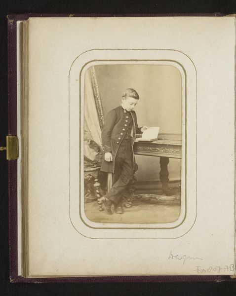Editor: So this photograph, “Portret van een jongen met een hoed op schoot,” by Charles Thomas Newcombe, dates from between 1862 and 1865. It's a gelatin silver print, and the little boy looks so solemn. What kind of story do you think it’s trying to tell? Art Historian: It’s a formal, staged image, typical of portrait photography of that era. Consider the hat resting on his lap - what could that symbolize? Editor: Maybe a symbol of class or status? Like, he's from a family of means? Art Historian: Precisely. Clothing and accessories were consciously used to project an image. Think of other symbolic elements: the ornate chair, the backdrop. They construct a narrative of belonging and aspiration. Notice the gaze…does he meet your eye? Editor: Not really, it’s like he's looking slightly away. Maybe he doesn’t want to be here. Was this a common look for the time? Art Historian: The averted gaze adds to the impression. This connects with a wider visual language of photography at this time. The photograph captures not only the boy but also, aspirationally, a social ideal. What emotions do these calculated symbols and expressions evoke in you? Editor: I see what you mean! I get how photography could shape stories back then and I can see the signs now that it has been staged! Thanks for your expertise! Art Historian: My pleasure! Each element plays a role in the cultural memory, creating an ideal. Analyzing images gives insights into understanding the culture behind the art.