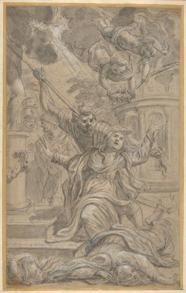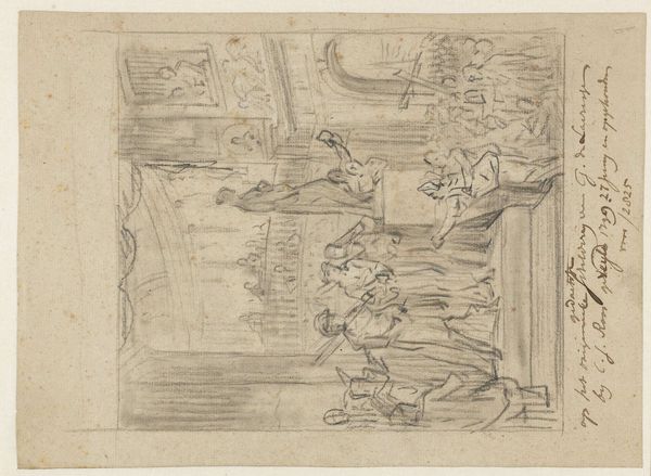 Curator: What a striking scene! I immediately feel a weightiness to it, despite the medium being something as simple as pen and ink. The urgency in the figures… Editor: Indeed. What we're looking at here is "Deathbed Scene," an anonymous work rendered in pen and brown ink on paper, dating somewhere between 1600 and 1700. It’s a powerful example of the history painting tradition even within a modest format. Curator: Modest, yes, in size and medium, but grand in ambition. Look at how the artist captures the raw emotion: despair, supplication, maybe even defiance. Is it a historical scene or an allegory? Editor: The drawing utilizes established iconographic motifs around death: the prominent religious figure near the head of the bed perhaps administering last rites, the grieving figure clutching what appears to be a skull... symbols of mortality. Curator: And how that figure with the skull dramatically occupies the foreground! The way he's posed, almost a mirror image of the dying man. The whole composition forces us, the viewers, to confront the finality of life. Where would such a drawing have been viewed at the time? What function would it have served? Editor: Likely this was preparatory, perhaps for a print, given its strong narrative qualities. The piece participates in a discourse on death and morality prominent during that era, a cultural fascination—or perhaps obsession—that was both a consequence and a commentary on disease, warfare, and an understanding of worldly vanity. Its exhibition probably had a didactic goal to elevate the spectator and improve public morals. Curator: Fascinating how an artist, even without a name attached to the work, could harness symbols and gestures to speak volumes. It prompts consideration of mortality across the centuries. Editor: A potent reminder, I think, that regardless of social status, depicted wealth, and privilege, the universality of death remains a leveller throughout history. Curator: Precisely. A stark visual memento mori indeed!