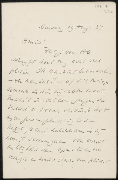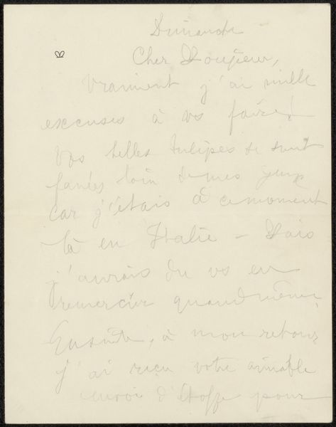 Curator: Today we are looking at a drawing by Baronne Madeleine Deslandes titled "Brief aan Philip Zilcken," likely created between 1876 and 1929. It’s crafted with ink and perhaps some pastel on paper. Editor: My immediate impression is one of quiet intimacy. The pale script gives off the feel of a private communication, tinged with vulnerability, like catching a glimpse into someone’s thoughts. Curator: Absolutely, the delicate lines and the sparseness of the composition contribute to this feeling. It's fascinating how the artist utilizes the negative space around the writing to emphasize its fragility. Note also how Deslandes deploys varied strokes in executing letter forms, and how this contributes to a sense of motion and dynamism in what could otherwise be a still representation of static lettering. Editor: Given Deslandes’s biography, I wonder if this "fragile health" described is not also representative of her status in a society that curtailed her autonomy as a woman artist. The act of letter-writing in itself became a space of power, particularly for wealthy or aristocratic women— allowing articulation in an often closed-off environment. I would venture to understand Zilcken's social positioning at this moment, as well, since he was himself a printmaker. What conversations might they have been having? Curator: Your reading through the lens of gender and class offers compelling layers. But it is worth adding how the script’s looping ascenders and descenders create an elegant dance across the page. Also observe the way that Deslandes has deliberately incorporated erasures and reworkings, and consider their expressive impact on the whole. Editor: It's in these details, both structural and social, that the true significance of the work reveals itself. Curator: Indeed. Paying such careful attention allows us a broader understanding and deepens our connection. Editor: Hopefully that gives us a place to reflect, if only for now, on this unique piece.