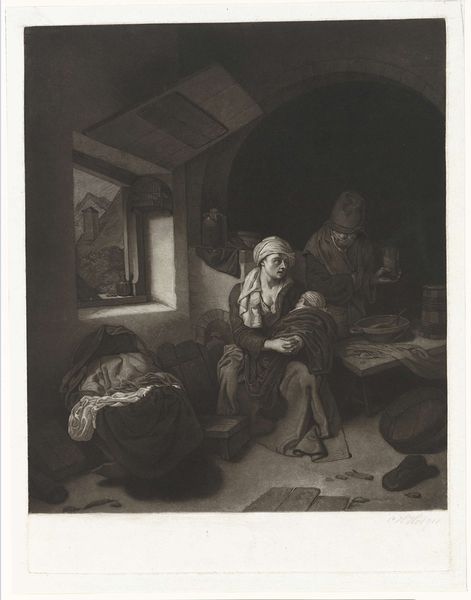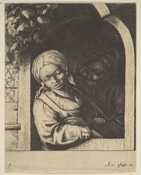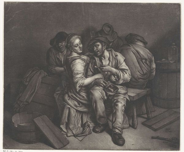 Curator: So, here we have "Seamstress and a Man", a piece made between 1658 and 1677 by Wallerant Vaillant. It resides here at the Rijksmuseum. The medium is engraving, which gives it such a striking linear quality, wouldn't you agree? Editor: My first thought? Intimacy. A stolen moment. The woman, she's so focused on her sewing, completely absorbed. The man is watching her so attentively, like he’s trying to figure out the mysteries of the universe that are contained within her focused gaze. It's cozy and heavy at the same time, right? Curator: Absolutely. This domestic scene, common in Dutch Golden Age genre paintings, subtly reinforces established social norms. We have the man observing, passively claiming ownership through sight, and the woman engaged in work deemed suitable for her gender. The details are incredibly potent when considered through a critical lens of labor and gender. Editor: See, that’s interesting because my first thought wasn't social norms. It was more like... does she even know he’s there? Look at her slipper cast aside, the absolute absorption in the making... perhaps we assume that the social code implies ownership over lived spaces when, in truth, the emotional labor that builds these domestic interiors could mean that these rules simply dissolve through practice? Curator: That is definitely something that cannot be excluded in its reading. Especially, the emotional implications can shift through an understanding of how deeply rooted and time-consuming this type of artisanal practice used to be for women. But don't you feel like her position feels, still, determined by her role, that the simple reality in this picture still speaks about that established division between them. Editor: I can agree on that point, perhaps these roles cannot ever disappear... it simply reflects how this division feels sometimes natural to its practitioners. Curator: In reflecting on this piece, one is urged to explore questions surrounding domestic labor, gender roles, and silent narratives embedded within seemingly simple depictions of everyday life in the Dutch Golden Age. Editor: Yes. Vaillant captured not just a moment, but a whole quiet story brimming with potential interpretations, of which each of them matters. That’s why this image has so much character.