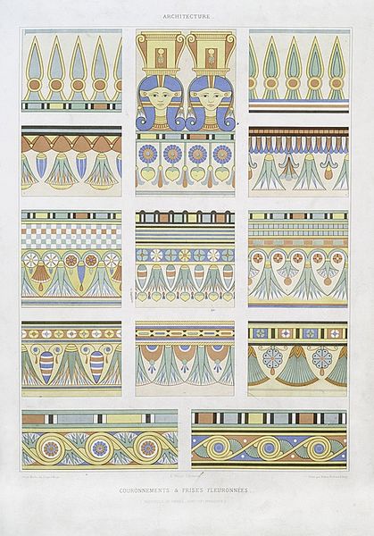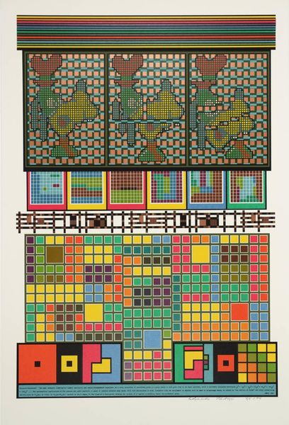 Curator: What a vibrant display of geometric patterns! There's such a joyful and ordered feel to the overall arrangement. Editor: Indeed. We're looking at "Egyptian No. 5," a print created in 1856 by Owen Jones. What you're responding to, I suspect, is that ordered logic that reflects his deep interest in the universal principles of design, here exemplified through Egyptian motifs. But is there something also subtly insidious about it? Curator: Insidious? How so? The colors seem so straightforward—primary blues, reds, and yellows. It's almost childlike in its simplicity. Editor: That's partly the point. The accessibility flattens a cultural significance, extracting visual data from a complex social and religious belief system to package it for European consumption. Remember that period: Egyptomania was at its height, fueled by colonial exploits and cultural appropriation. These weren’t just pretty patterns for the Victorians; they represented power dynamics. Curator: So you're saying this ostensibly decorative print participates in a broader project of colonial representation? Taking pieces and claiming an authority of understanding? Editor: Precisely. Even the act of categorization, assigning a number, contributes to an erasure of contextual meaning, and presents these patterns as easily reproducible commodities divorced from their ritual and symbolic purposes. Curator: I suppose that's why, while admiring the intricate geometries, I feel an underlying tension. There's a disconnect, isn't there, between the graphic beauty and the weight of its historical baggage? It's pretty, but, stripped of its significance and intention, what exactly *is* it communicating beyond design ideas? Editor: Exactly! Thinking about the social history helps re-situate our contemporary response to what we are looking at here today. The vibrant color still has appeal and yet what does it represent for all the people affected by this visual representation? Curator: Seeing it like that reshapes my entire perception. It’s not merely about admiring these patterns but also about questioning the context of their production and consumption. Editor: Absolutely, and that’s the constant conversation we have to maintain when engaging with art. It's not always about aesthetic judgement but rather contextual understanding.