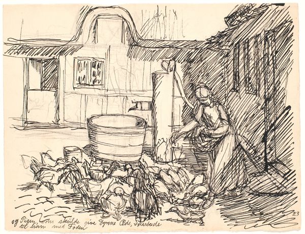 Curator: Good morning. We're standing before "Woman Emptying a Bucket," an ink drawing from between 1834 and 1875, crafted by Pierre Millet, and currently held here at the Rijksmuseum. Editor: There’s a captivating simplicity to this sketch. The starkness of the lines against the blank space evokes a sense of solitude, doesn't it? A deliberate choice to reduce the scene to its essence, lending it a potent visual directness. Curator: Absolutely. Millet's decision to render the scene with just pen and ink emphasizes the unadorned reality of peasant life, aligning with the Realist movement of the time. Consider how the image resonates with the broader cultural understanding of labor, specifically a woman's work, in the 19th century. Editor: The composition really draws my eye. Note how the architectural features – the doorway, the suggestion of a house – create a strong vertical anchor. Then you have the diagonal formed by the woman's body leaning forward, mirrored subtly in the scattering droplets. Curator: Those details certainly amplify the narrative. Pouring water was often laden with symbolic weight; renewal, cleansing, or even an attempt at controlling nature’s abundance. One must reflect on the arduous daily tasks, almost rituals, women performed, and the values attached to those labors. The empty bucket almost carries a double meaning; not just labor, but also need. Editor: That repetition of rounded forms, too: the buckets, the woman’s headscarf, and even the suggestion of her posture. It creates a pleasing visual rhythm, softening the potential harshness of the scene, like a visual echo. Do you suppose Millet intentionally used circular imagery? Curator: I’d argue the deliberate artistic choices were to evoke sympathy and dignity in his subject rather than mere sterile objectivity. Millet invites us not just to observe, but to empathize. Editor: It’s an incredibly direct and immediate drawing. A very distilled vision. The artist has certainly crafted an affecting portrait. Curator: A picture indeed loaded with visual and emotional depth, making us mindful of cultural memories related to daily rituals. Editor: A brief, suggestive sketch, yet incredibly articulate in its construction and representation.