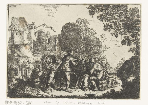 Frans Greenwood created this engraving, "Speech by a Captain of the Civic Guard," in the 18th century. It captures a moment of civic life deeply rooted in Dutch society. During the Dutch Golden Age, the schutterijen, or civil guard, were not merely military units; they were cornerstones of community identity, composed of middle-class citizens tasked with defending their towns. Greenwood, as an engraver, disseminates their image, solidifying the schutterijen's role in the collective imagination. The captain, likely a man of stature within the community, addresses his company, underscoring the themes of duty and unity. In the cultural context of the time, where the burgeoning merchant class gained influence, the schutterijen represented a form of localized power. It's an image imbued with a sense of social order and civic pride. The work is also reflective of the gendered dimensions of public life in this era. In witnessing this artwork, we are confronted with questions about who holds power and how they exercise it, in both historical and contemporary society.