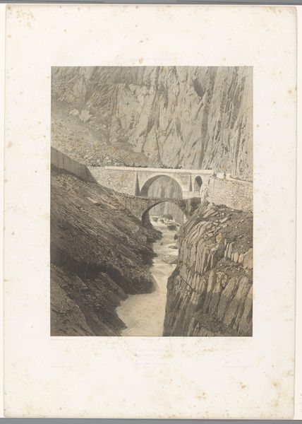 Eugène Cicéri created this print, "Wandelaars op een brug door de Trientschlucht", in the 19th century. At that time, the rise of Romanticism emphasized the sublime power of nature and humanity’s small place within it. Here, we see figures on a bridge dwarfed by the towering rock faces of the Trient Gorge. It’s not just a landscape; it’s a stage where we contemplate our own existence. Who are these wanderers? Are they tourists, or are they allegorical figures? The gorge itself becomes a metaphor for life's journey. Prints like this circulated widely, shaping perceptions and desires. In a way, the image participates in the construction of both personal identity and a collective understanding of nature. It invites us to reflect on our own paths, the bridges we cross, and the chasms we navigate.