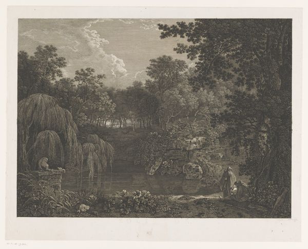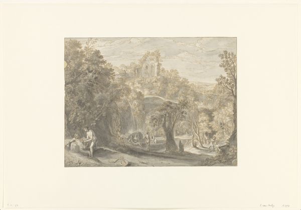 Paulus Lauters created this artwork called "Temple Ruins" sometime in the 1800's. Using shades of grey and brown to make this print, Lauters draws us into a world where nature reclaims what humans have left behind. The composition uses linear perspective to lead the eye towards the ruins. It is surrounded by an overgrowth of trees which are towering over the architecture. The ruins themselves, rendered with careful detail, show the effects of time and decay. The structure is crumbling, stones are displaced, and yet the form still speaks of its original grandeur. Lauters seems to destabilize the idea of permanence by showing how nature and time affect the world around us. The ruins and surrounding people remind us that everything is in a state of flux. It is the careful balance between these elements that makes this piece a visual statement on the transient nature of civilization.