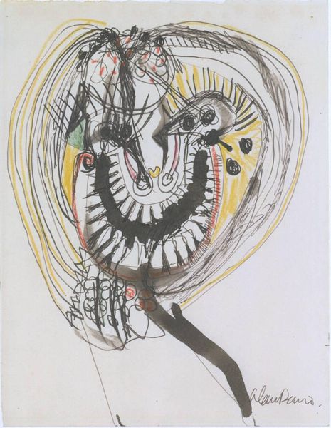 Curator: Let’s discuss Fernand Léger’s print, "Circus," created in 1950. It’s currently housed at the Musée National Fernand Léger in France. Editor: Well, my immediate reaction is… vibrant yet unsettling. The stark lines combined with those bold dots against the fragmented form – there’s a tension that pulls you in. Is she dancing, or trapped? Curator: Léger, known for his contributions to Cubism and his focus on the dynamism of modern life, often depicted the circus. Consider the cultural context: post-war Europe grappling with rebuilding, and the circus served as a potent symbol of resilience, spectacle, and perhaps a touch of escapism. Editor: I can see that. The use of the fragmented body is interesting, a female form stylized almost to the point of abstraction. How does this relate to the period’s broader conversations about the objectification and performance of femininity? Curator: Absolutely. Think about the linocut print medium; that suggests a level of accessibility. Léger believed art should be for everyone. He's playing with form and color to explore not just representation, but the experience of witnessing the circus—the energy and controlled chaos. The figure, with her simplified form, becomes almost every woman, pushing back on rigid gender norms. Editor: So the bright color, the simple, almost naive forms belie the artwork’s complex conversation regarding both art’s place in society and shifting cultural dynamics regarding the female body. Are those red dots a deliberate statement, a commentary about performance and scrutiny? Or even an allegory for women and performance. Curator: Perhaps. And the way Léger employs linocut emphasizes graphic simplicity. These choices also comment on fine art tradition – questioning what "high" art truly constitutes when accessible mediums render visually stimulating results. The circus allowed him to explore these avenues. Editor: Léger's bold move opens a wider consideration, indeed. Now, I view it in this artwork as less whimsical spectacle and more the tightrope of being a woman within those structures. Curator: That’s a powerful perspective. Léger’s “Circus,” seemingly a cheerful circus scene, becomes a poignant symbol through this lens into societal issues.