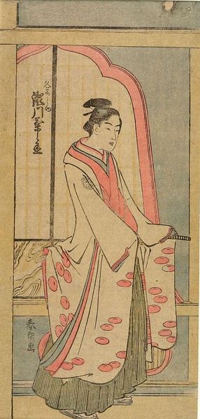 Curator: This is a woodblock print by Katsukawa Shunko entitled "Actor (Old Man) Dancing," currently held at the Harvard Art Museums. Editor: It's whimsical, isn't it? Almost like a joyful caricature. There's a lightness that defies his age, whatever age he's portraying. Curator: Kabuki theatre during the Edo period was rife with such roles. Prints like these served as promotional material, celebrity snapshots if you will, fueling the popularity of particular actors. Editor: The simplicity is deceptive. Look at the lines in his robe and the gentle curve of his smile. It captures a certain essence of performance, a fleeting moment of exuberance. Curator: Precisely. These actor prints, or yakusha-e, were instrumental in shaping public perception and immortalizing these performers within the cultural landscape. Editor: It makes me wonder what stories he's telling with that upward gaze and the elegant tilt of his stick. A whole world suggested in a single pose. Curator: Indeed, it invites a dialogue between the performer, the print, and the audience. Editor: A dance frozen in time, yet still full of movement. I find that quite beautiful.