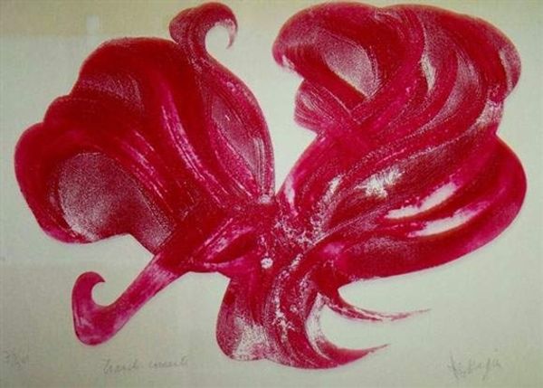 Curator: Ellen Gallagher’s "Watery Ecstatic" from 2004 is before us, rendered with a stark yet compelling visual vocabulary. Editor: My first impression? It feels both ancient and utterly contemporary, like a fossil seen through a pop art filter. The limited color palette is unexpectedly soothing. Curator: Indeed, the reductive color scheme accentuates the labor-intensive printmaking process, potentially linocut. Gallagher’s choice of materials becomes a narrative element, alluding to the slow, deliberate process of crafting this image, this lone chambered nautilus, isolated against all this whiteness. Editor: All that negative space! It really makes the shell feel…unmoored, adrift. And the color—it's a deep, rusty red, almost like dried blood. Do you think there’s an intentional rawness here, playing against the geometric perfection of the spiral? Curator: That rawness, as you call it, is precisely what intrigues me. I wonder if Gallagher intends to evoke not only the natural form of the nautilus but also its consumption within broader material culture. The nautilus shell, historically prized as a decorative object, represents a confluence of natural beauty and human desire. Editor: Yes! There’s almost a hint of tattoo art happening too, or even microscopic images of cells! Maybe she’s pushing at our sense of scale here; is this immense or miniscule? Are we seeing the detail or a whole cosmos contained within? Curator: These swirling connections are so rich to unpack; the artist utilizes such reductive elements to tease them out for us, challenging our expectations for what is worthy of being deemed "high" art. The very act of taking a common natural object, reproducing it through the printmaking, questions traditional artistic hierarchies. Editor: Absolutely, it’s an odd mix that somehow coheres: science illustration meets primal doodle. I keep getting drawn to the… wetness of the red pigment. It almost seems like this nautilus just emerged, slick, from the ocean. Curator: Ultimately, “Watery Ecstatic” functions on so many levels. It compels us to reconsider how we engage with both natural forms and modes of artistic production, prompting introspection on human intervention, in ecological systems, artistic hierarchies and beyond. Editor: Well, Gallagher's nautilus has definitely shifted my own perspective a few degrees! There's something beautifully unresolved and profoundly engaging about it.