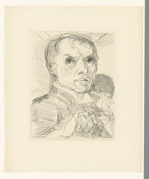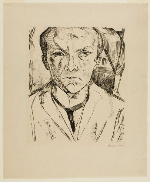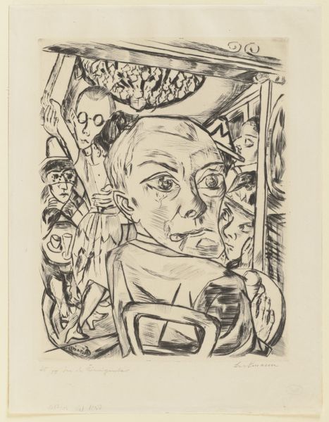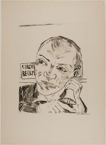 Editor: This is Max Beckmann's "Self-Portrait in a Hotel," a stark and somewhat unsettling print. It's interesting how he depicts himself in this environment. What can you tell me about it? Curator: Beckmann's work often reflects the materials and conditions of its creation. Consider the stark lines of the printmaking process itself, mirroring the fractured experience of the interwar period and the artist's own displacement. This speaks volumes about the social context of its production and consumption. Editor: So, the method of making the artwork conveys the message? Curator: Precisely. The materials, the labor involved in printmaking, and its accessibility as a medium all contribute to its meaning. It democratizes the self-portrait, moving it away from the elite oil painting. Editor: I see, it's like he's making a statement about art’s role in society. Thanks! Curator: Indeed, and by considering the means of production, we gain a deeper understanding of Beckmann's artistic vision.