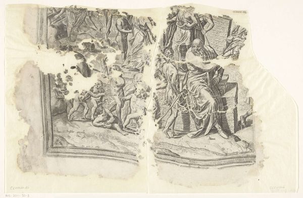Curator: Abraham de Bruyn, working somewhere between 1576 and 1596, gives us "Spaanse ruiter en picador," an engraving residing here at the Rijksmuseum. It’s presented in two segments on the aged paper, showing equestrian figures. What catches your eye? Editor: The immediately striking thing is the fragmented state. Both engravings have sustained damage, wear and tear...they communicate an echo of stories lost in time, histories that demand excavation. There is something poignant in how time and circumstances impact representation. Curator: Indeed. The print depicts horsemen, a subject not unusual for the era. I read these images, even in their damaged condition, as testaments to the power structures embedded within aristocratic European society. Notice the Mannerist style - an interest in elongated figures and intricate details Editor: It's intriguing how fashion of the era is being elevated here as signifiers of wealth and status and privilege, which certainly resonates within contemporary discourse. Curator: Absolutely. When we analyze such pieces through the lens of social history, the imagery provides insight into hierarchies, military culture, and the glorification of equestrian skills among the nobility. It also hints at colonialism because Spanish power and its display depended heavily on what happened in colonized lands. Editor: Yes, a potent intersectional lens. To further emphasize the context, thinking of the relationship between man, horse, and military expansion and classism creates even more interesting conversations about power and control in a society shaped by patriarchy. I also wonder about its initial reception. The common people must have viewed it very differently. Curator: No doubt, particularly because it would have been far less common to even see a horse up close. These kinds of images affirmed the existing order, even with its details that we can now dissect. I wonder, though, looking again at its damaged state, if history and accident reveal how that order eventually breaks down. Editor: That is it precisely. So many fascinating themes and layered complexities emerge. Thank you, Abraham de Bruyn! Curator: A pleasure as always. Thank you.