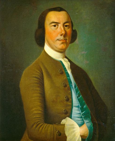 Curator: Standing before us is an oil painting dating back to around 1770. The artist is John Durand, and the work is titled "John Lothrop". Editor: He looks a bit… uncomfortable, doesn’t he? Stiff, almost. Like he’s been told to sit still and think about England. Curator: Indeed. We're seeing echoes of Neoclassicism here, particularly in the composition's formality. But look closer. There are elements here also reminiscent of the academic style; notice how every button, every ruffle, is meticulously rendered? Such details were deliberate statements about status and the subject’s refinement. Editor: Oh, absolutely. The power dressing of the 18th century! That burnt-orange coat screams, "I’m somebody, or at least, I aspire to be!". Still, I sense a hesitancy there, like he is consciously putting on this facade of composure. I wonder what a modern psychologist would say? Curator: Perhaps the tension speaks to the broader pre-revolutionary context? After all, symbols speak of cultural memory, and clothing serves as an explicit cultural artifact that also implies status or hierarchy. Consider how Lothrop has been intentionally depicted with books, a quill, and an inkpot – a reference to his position in society. Durand uses this type of symbolic language very deliberately. Editor: A symbol carefully designed, no doubt! I imagine those heavy tomes convey "wisdom," and that quill and inkpot certainly signal not just education, but, as we move toward the revolution, authority of the word. Maybe his slight unease comes from the shifting sands of that very authority. Curator: It's an astute observation. I agree that reading this work only at face value misses the greater subtleties behind that controlled outward presentation. Editor: Yes, images of powerful men are potent sites for psychological projection. Even across centuries, these images allow viewers to consider questions about stability and legitimacy during revolutionary times, while hinting, through our modern perspective, at the shifting complexities underneath. What do you make of that small, self-satisfied smile? Curator: The layering is fascinating. Each symbol functions simultaneously at a few levels to speak on this subject's position in culture. To consider that our interpretation of each symbolic function also speaks on modern-day interpretation and theory… I have new perspectives now after this consideration. Editor: As do I, seeing it all unfold, one layer at a time, lets us consider, and re-consider how individuals want to present themselves at specific times. Thank you!