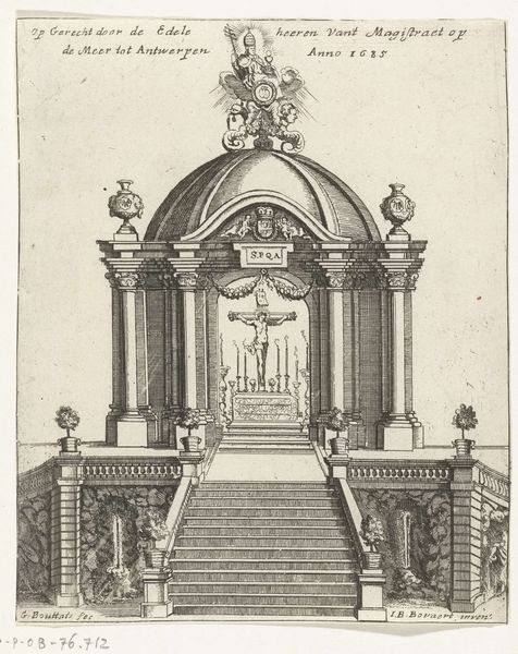 Editor: Here we have an engraving from 1775, illustrating the firework display held to celebrate the bicentennial of Leiden University. It’s titled "Podium voor het vuurwerk bij de viering van het Tweede Eeuwfeest van de Leidse Hogeschool, 1775," made by an anonymous artist. I'm immediately struck by the very deliberate structure, the formal balance and classical elements… what can you tell us about it? Curator: The image resonates deeply with its historical moment, a carefully constructed performance of civic pride. Think of this not merely as a depiction of a fireworks display, but as an articulation of Leiden University's identity. The symmetrical architecture, the allegorical figures – they're all signifiers. Editor: Signifiers of what exactly? I mean, the figures feel rather… stoic? Curator: Precisely. They evoke a sense of tradition and established knowledge. Consider the central female figure atop the structure; what cultural echoes does she summon? Editor: She’s holding what looks like a laurel, so… Victory? Wisdom? And isn’t that Minerva inside the archway? She represents wisdom and strategic warfare… maybe suggesting the University's intellectual strength as a defense for the city. Curator: Good. And consider how fire, traditionally a symbol of purification and transformation, intersects with this theme of academic enlightenment. It isn't random; the illuminations speak to aspirations. These spectacles affirmed existing social structures and power, didn’t they? Even the very act of memorializing it through engraving! Editor: I never thought of a fireworks display as being so… political. I was just imagining all the sparks and noise! Curator: These meticulously planned images cemented historical memory and affirmed shared cultural values, reflecting deep psychological and cultural currents. Always look beyond the surface! Editor: So much symbolism! It gives the piece a completely different context for me now. Thanks for pointing that out!