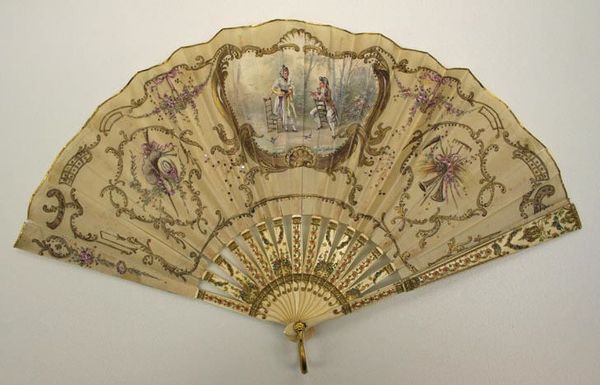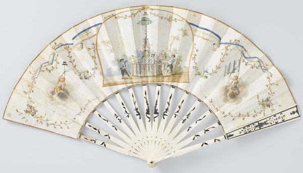 Editor: So, this object is a folding fan with three medallions painted on it. It's dated to around 1775-1785. The artist is anonymous, but the material is paint on… something. Looking at the fan, there’s a sense of delicacy. What catches your eye in this piece? Curator: The symbolism speaks volumes, doesn't it? The central image presents, likely, a scene near an inn – a social hub. Flanking this are putti, those cherubic figures, seemingly playing with birds. Birds often symbolize the soul or freedom, even divine messengers, caught, in a sense, by earthly delights if we consider them 'pets.' What tensions do you see here, if any? Editor: I guess I hadn't thought of it as a tension, but you're right. The putti and birds enclosed in the medallions almost seem…controlled. Whereas the central image of the figures in the courtyard suggests bustling, public life. Curator: Precisely! Consider that this was a functional object, held, displayed, concealed. The fan itself becomes a performative piece, an instrument in courtship or conversation, maybe to encourage reflection. Think about the coy movements with it. How can something simultaneously reveal and conceal secrets? Editor: That's fascinating. So it's not just decoration, it's a tool with layers of hidden meanings! I never considered the actual object's movement being part of the statement. Curator: Exactly. The cultural memory embedded in such an object. Rococo celebrated leisure, but even in frivolity, there's often a moral undercurrent, a commentary on societal values expressed via symbolic elements, perhaps hidden in plain sight. What is luxury without that? Editor: I see what you mean. This little fan encapsulates a whole world of social interaction and subtle messaging. Thank you! Curator: It was my pleasure to shed light on some historical semiotics with you. Always seek beyond what initially meets the eye and ask why the artist made these choices!