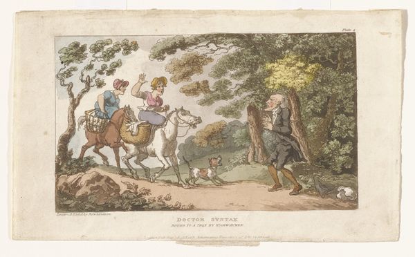Editor: Here we have Reinier Vinkeles's "Wagen met twee paarden bij de uitspanning De Donkere Kuil bij Haarlem," likely from 1815. It’s a pen, ink and watercolour drawing currently held at the Rijksmuseum. There’s a charming, almost naive quality to the rendering, especially in the figures and horses. How would you interpret this work, focusing on its compositional elements? Curator: Certainly. Notice first the relatively simple composition: a dominant horizontal axis reinforced by the wagon and the building's structure, against which the organic verticality of the tree offers a visual counterpoint. The subtle washes of color, primarily muted greens and browns, create depth but do not distract from the linearity of the drawing. What effect do you think this combination achieves? Editor: I guess the muted colours make it feel more like a sketch? It doesn’t feel overworked. It keeps that sketchbook quality. Curator: Precisely. The unfinished quality emphasizes the immediacy of the artist's observation. Consider the structural interplay between line and wash: how the crisp ink defines forms, while the watercolour adds atmospheric perspective, softening edges and creating spatial recession. Editor: I see that now! The building is sharper, more clearly defined and angular. While the horses seem like their edges bleed into the scene through the watercolour. That’s a great touch to bring attention to the foreground, where the real action happens! I never would have noticed that. Curator: Yes, notice too the rhythmic distribution of figures—each occupies a distinct spatial plane, creating a measured sense of movement across the composition. Ultimately, it's through this rigorous interplay of elements that Vinkeles constructs a compelling visual experience. Editor: I hadn't considered the positioning of figures so carefully! Thank you for highlighting the structure of the illustration.