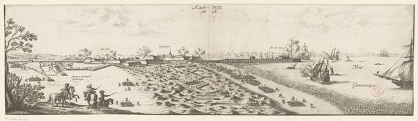 Curator: Romeyn de Hooghe created this etching, "Blockade of Antwerp, 1585," well after the actual event. The print depicts the siege of Antwerp by Spanish forces. Editor: It’s a grim scene, isn't it? The sheer number of soldiers and ships conveys the immense scale of the conflict and the intense pressure on the city. You can almost feel the tension. Curator: Indeed. De Hooghe's print provides insight into the political and military strategies of the time, showcasing the power dynamics between the Spanish and the Dutch. Consider how the representation of military might reflects broader imperial ambitions. Editor: And the way the artist’s perspective is positioned, almost as if we are observing from a place of privilege, detached from the suffering, raises questions about spectatorship and complicity. Curator: Precisely. Looking at how the historical narrative is constructed here provides a lens through which we might reflect on contemporary conflicts and their representations. Editor: Absolutely. It's a stark reminder of the human cost of war and the enduring power of images to shape our understanding of history.