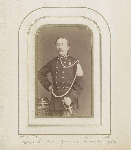 This is a photograph of Captain Van Eysden, a Dutch military man, made by Johan Christiaan Reesinck. It's a small object; the print is mounted on card and embellished with gold leaf. Photography in this era relied on chemical processes, light-sensitive emulsions carefully applied to surfaces, and darkroom techniques to produce an image. It was a complex blend of science, craft, and artistry. What you see is the outcome of manual dexterity and technical knowledge. Reesinck had to master these skills to produce images that satisfied the growing demand for portraiture, from people like Captain Van Eysden. The photograph itself reflects broader social issues of the time. It captures the rise of a new middle class, with disposable income and aspirations for upward mobility. Photography democratized portraiture, making it accessible to a wider audience than traditional painting ever could. Considering the materials and processes used to make this photograph helps us to understand its social and cultural significance, and challenges our conventional ideas about fine art and craft.