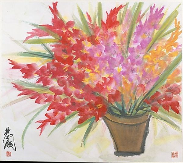 Editor: So, this watercolor is "Flowers (Bellagio)" by Walter Gramatté, created sometime before his death in 1929. I’m struck by the almost melancholy mood despite the vibrant colors. What do you see in it? Curator: The blooms, especially the red gladioli, are symbols of strength and integrity, even defiance. Yet, placed against that cool blue, almost watery background, they evoke a sense of transience. The flowers push upwards, a testament to life, but the watercolor medium suggests fragility. What does that tension say to you? Editor: Maybe it’s about the fleeting nature of beauty, or the struggle to hold onto something vibrant in the face of… well, everything? Curator: Precisely! Gramatté captures the inherent duality of existence, the dance between blossoming and fading. It’s a powerful meditation. Editor: I hadn't considered the tension between the flowers and the medium itself, that brings a new layer to the work for me.