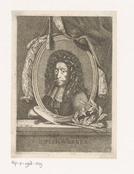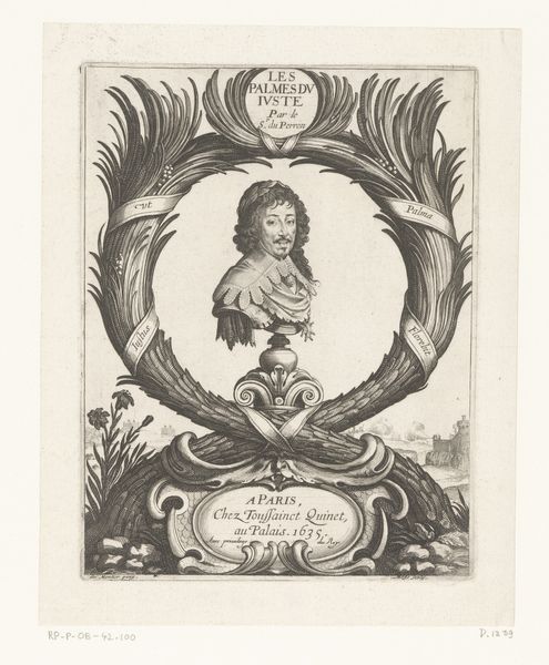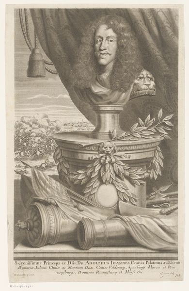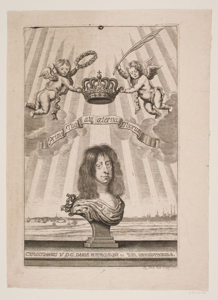 Editor: So, this engraving by Albert Haelwegh, "Christian V," created around 1670... it's quite a statement, isn't it? I find the composition, with the bust elevated above the landscape and the angels holding the crown, to be rather…grandiose. What are your thoughts when you see this print? Curator: It’s interesting that you use the word "grandiose." I immediately see it as a piece of political propaganda. Consider the context: printmaking in the 17th century was a powerful tool for disseminating information and shaping public perception. This isn't just a portrait; it's carefully constructed to convey specific messages about Christian V's power and legitimacy. What kind of messages do you think the artist wants to transmit to the public? Editor: Well, with the angels and the crown, certainly divine right and legitimacy come to mind. The rays emanating from behind are also visually reinforcing that idea. It’s like they’re trying to depict him as divinely appointed. Curator: Precisely. And consider who would have viewed this image. Prints like this were not just displayed in royal palaces. They circulated amongst the burgeoning middle class, reinforcing social hierarchies and the power of the monarchy. It becomes a part of building a shared visual language. Do you think that this would have been an effective tool for Christian V? Editor: I suppose if it’s visually present in all strata of society then it probably succeeded to some degree. Even now, as a student centuries later, my mind makes those same connections to divine right even without knowing the specifics of the king. Is that what we are supposed to take away? Is art just a tool for political manipulation? Curator: I think manipulation is too strong a word. Think of this engraving as a reflection of the complex relationship between power, art, and public perception. This is about social commentary and the negotiation of authority through visual means, a phenomenon still very relevant in our contemporary world. Editor: So, by looking at it as a socio-political artifact we can actually read and study the society that created it. Fascinating! Thanks for sharing a completely different view! Curator: Thank you, too. It’s valuable to be reminded of art's continued socio-political roles.