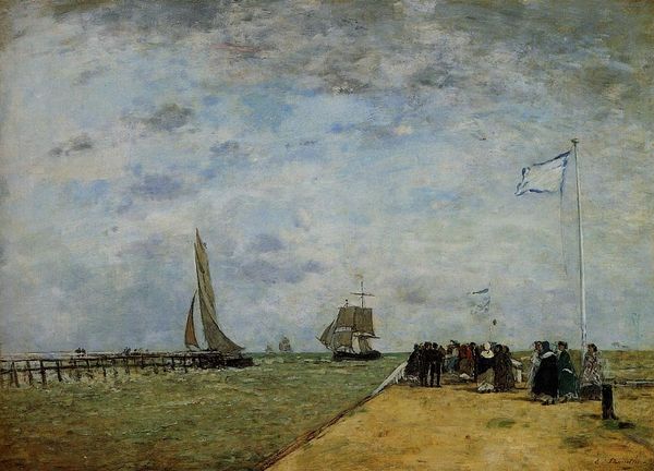 Curator: Upon first glance, I'm struck by the overcast mood of the piece, but with warm shades creating an atmosphere that feels dreamlike rather than bleak. What do you make of it? Editor: That's a good observation. Let’s orient ourselves: What we're looking at here is "Pier at Deauville," painted in 1869 by Eugène Boudin, a key figure in French Impressionism and an influence on Monet. Curator: I find the composition interesting: it's this band of land bisecting the canvas between the beachgoers below and the atmospheric, swirling clouds above. I'm curious about the symbols for leisure at play. Do they offer us an entry point for deconstructing bourgeois society and the gendering of recreational spaces? Editor: The flag clearly marks this space as France; meanwhile, for me, those swirling clouds speak volumes. Boudin was a master of capturing the transient effects of light and atmosphere; in fact, he insisted on painting en plein-air, directly observing nature. Clouds are always powerful symbols, reminding us of forces greater than ourselves, as well as transitions, freedom, and ephemerality. Curator: Considering Deauville’s transformation during the Second Empire as a luxury seaside resort catering to an increasingly consumerist and leisured Parisian bourgeoisie, Boudin's choice to represent this specific locale subtly critiques societal stratification. I suggest that reading his work as purely aesthetic overlooks this essential socioeconomic commentary. Editor: I see your point. Those details certainly feed into a narrative of emerging bourgeois pastimes, although I wonder if we risk overburdening his brushstrokes with contemporary social anxieties. Regardless, the work provides us with some amazing windows into the social norms of its time. The very act of witnessing these seaside promenades through his artwork reflects the burgeoning intersection of art and social observation in this period. Curator: Agreed. Overall, reflecting on "Pier at Deauville," what strikes me is the potential of landscape art to engage critically with social phenomena and underscore power dynamics. Editor: For me, it’s this captivating blend of reality and transience and, of course, the universal visual symbolism of the sea and sky that stay with me.