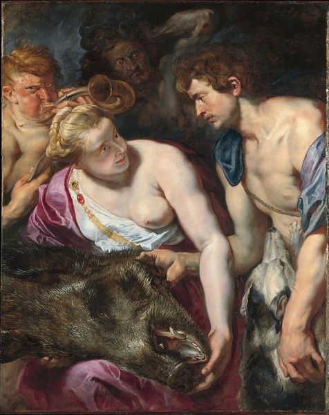Peter Paul Rubens’ painting, "Meleager and Atalante" presents a scene steeped in classical mythology and painted with a baroque sensibility. Rubens, working in the 17th century, a time marked by the rise of powerful monarchies and the complexities of religious reform, often turned to mythological subjects, reflecting both the era’s fascination with the classical world and its own evolving social dynamics. Here, we see the hero Meleager presenting the spoils of the Calydonian Boar hunt to Atalante, a female figure, often depicted as a huntress and athlete. The composition explores gender roles within the context of heroism and power. Atalante, though participating in the hunt, is still rendered as a figure of beauty. Rubens captures a moment heavy with the tensions of love, rivalry, and destiny. It invites us to consider how these ancient stories continue to shape our understanding of gender, power, and fate.