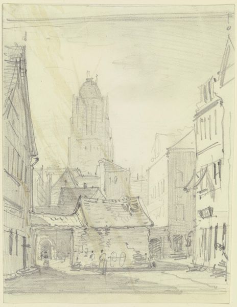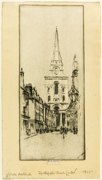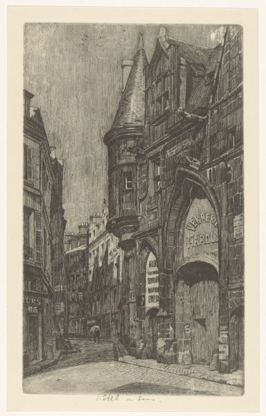 Editor: This is "Stadsgezicht," a cityscape etching by Wilhelmus Franciscus Marsman, created sometime between 1909 and 1924. The scene is quiet and almost dreamlike, the buildings are detailed, but what I noticed first are the strong telephone wires overhead, how would you interpret this work? Curator: Those wires are key, aren’t they? Juxtaposed with the traditional architecture and cobbled street, they signal the emergence of modernity, the tension between old and new. I see a society on the cusp of change. Where do these new technologies fit into traditional class structures and gender roles? This period saw burgeoning social movements… what do you think Marsman might be saying about the people within this changing urban landscape? Editor: It feels like a document of a very specific, transitional moment. Were etchings like this commonly used to represent social issues at the time? Curator: Absolutely. Printmaking was a more accessible medium than painting, allowing for wider dissemination of images and ideas. Think about the role of printmaking in political cartoons or disseminating information about social reforms. Marsman could be inviting us to consider how industrial advancement impacts daily life and the community. How does the looming church factor in? Editor: That's an interesting question. I hadn't considered it that way; perhaps it's about questioning faith amidst technological advancement? Curator: Or perhaps reflecting on enduring community values amidst social upheaval. These buildings aren't just stone; they are repositories of collective memory. Art provides space for questioning these things. Editor: I never thought about etchings having such a complex cultural meaning! It has definitely made me view this art in a completely new way. Curator: Indeed, art like this holds within it, histories that we may consider in new ways.