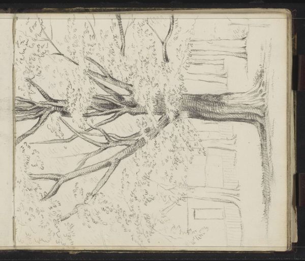 Editor: Here we have Willem Cornelis Rip's pencil drawing, "Boom te Scheveningen," created sometime between 1891 and 1898. It's quite striking – almost feels like two separate studies brought together. The starkness of the drawing really draws you in. What do you see in this piece, particularly from a historical perspective? Curator: Well, drawings like these offer us a glimpse into the artist’s process, his methods. These preparatory sketches become important social documents of artistic training. Rip clearly intended this for his personal use. This sketch can illuminate the ways in which landscape and the natural world was viewed, studied, and aestheticized through art practices. It also allows for comparison – how were his drawings used in larger compositions later? Were these sketches part of a formal curriculum, part of a social or artistic practice that would shape his final works, and indeed shape public consumption of landscape painting? Editor: That’s a fascinating point – the idea of it as a social document rather than simply a piece of art in isolation. Do you think the lack of figures or any sort of human presence contributes to this idea? Curator: It absolutely does. Landscape art in the late 19th century wasn’t just about pretty scenery; it was deeply entwined with ideas of national identity, progress, and our place within a rapidly changing industrial world. By omitting figures, Rip may be emphasizing the power and perhaps the indifference of nature itself, which ties into anxieties of the age, or is it about human relationship to that force. Is this an assertion of individual existence or something else? Editor: I never really considered how the absence of something could speak so loudly! So it becomes more than a study, but speaks volumes about its contemporary context and artistic intent. Curator: Precisely! Art reflects and shapes its world. And in the dialogue, it offers ways to see, think, and create the future. Editor: This was extremely insightful! I will definitely keep this in mind. Thanks.