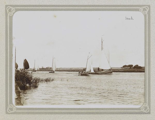 Curator: I'm immediately drawn to the subdued atmosphere in this image. The monochromatic palette feels so somber and nostalgic. Editor: Indeed. We're looking at a gelatin-silver print titled "Zeilschepen op de Maas," or "Sailing Ships on the Meuse," attributed to Folkert Idzes de Jong. Its creation is estimated to be sometime between 1905 and 1907. It really captures a sense of industry, doesn't it? Curator: Absolutely. The composition directs my gaze across the water, noticing the contrast between the smaller, possibly steam-powered vessels, and the sailing ships themselves. They are potent symbols of tradition being encroached upon by modernity. You see that progression of power represented on the water. Editor: Precisely. And how the city looms in the background, emitting smoke from factories, signifies a new reality for this port city. It really reminds us that ports are central to the exchange of goods and ideas and, also unfortunately, sources of pollution. Curator: Consider how de Jong presents this river too, almost mirroring the sky in tone, blurring boundaries. Perhaps a metaphor for the fluidity of change, the uncertainty that these port cities faced as they industrialized. Water itself holds layers of symbolism; the unconscious, journeys, and cleansing all come to mind. Editor: It is intriguing how a single photographic print manages to say so much about its time. This particular photograph speaks to me about the transition between sail and steam. Also, it touches on larger shifts in economy and labor happening during this period, the kind that reshaped cities along with individual livelihoods. Curator: Right, those shifting livelihoods, caught on film. Before a complete takeover. The quiet mood gives the work added weight. Editor: And the composition creates the context that adds such historical significance. It makes me consider the future implications that this transition posed on society, on the lives of workers specifically. I also think about our role in presenting works such as these. Curator: Exactly. Visual reminders and ongoing dialogues connecting the past to the present, and urging questions for the future. Thank you. Editor: It was my pleasure.