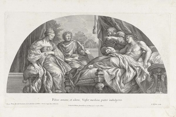 Curator: I find this print, Pierre François Basan's *The Denial of Saint Peter*, so compelling in its composition. The dimensions of the sheet are approximately 37 by 42.5 centimeters. Editor: It strikes me as a scene thick with tension; the faces are so expressive, locked in this moment of accusation and denial, hinting at larger themes of power and betrayal. Curator: The contrast between Peter and his accusers is palpable, but I find myself drawn to the textures—the rendering of metal armor, the fabric folds, all created through the skilled use of engraving techniques. Editor: Absolutely. And consider the socio-political implications of such a scene, particularly given Basan's position as a prominent printmaker. It's impossible to detach this image from debates about faith, authority, and individual conscience during the Enlightenment. Curator: Right, these details emphasize the labor and intentionality embedded in Basan's prints, elevating them beyond mere reproduction to become powerful statements in their own right. Editor: Indeed. It speaks volumes about how art can mediate power dynamics and force us to confront uncomfortable truths about ourselves and our societies.